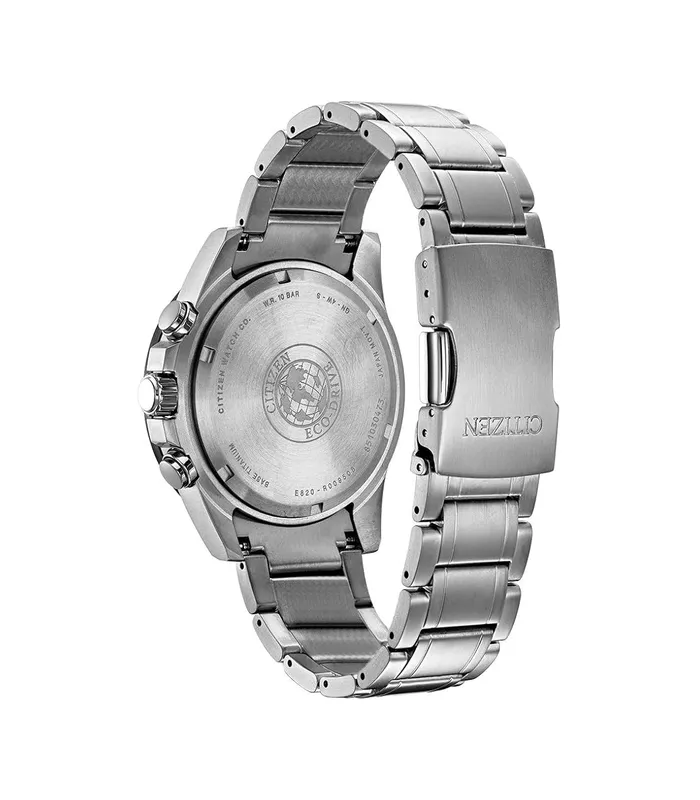 Take things up a notch with this Super Titanium CITIZEN Brycen timepiece. Includes a 1/20 second chronograph up to 60 minutes, 12/24 hour time, perpetual calendar, dual time, tachymeter, date and alarm. The Super Titanium case and bracelet is completed with a midnight blue dial. Featuring our Eco-Drive technology – powered by light, any light. Never needs a battery. Caliber number E820.