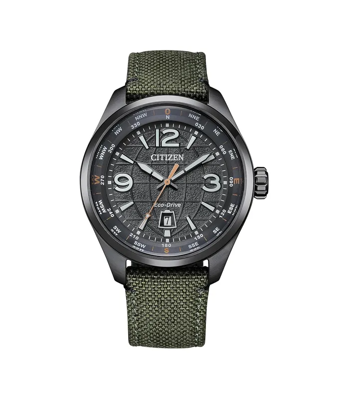 Citizen Men’s Eco-Drive Weekender Sport Casual, Gray Stainless Steel Watch, Green Nylon Strap, 3 Hand, Date (Model: AW1837-11H).